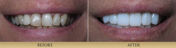 Through artistry and laboratory technique, we achieve outstanding and beautiful results restoring teeth with all- Porcelain Veneers and Porcelain Crowns. The cutting edge technology of adhesive bonding dentistry makes these restorations second to none. Many of the before and after cases you see here utilize this type of restoration-note their lifelike vitality. By removing unhealthy or cracked tooth structure and replacing it with natural looking porcelain, which fits the tooth like a thimble or jacket, we protect the remaining tooth structure and achieve a beautiful result.